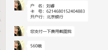 户 名:刘睿 卡 号:6214680152404883 开户行:北京银行