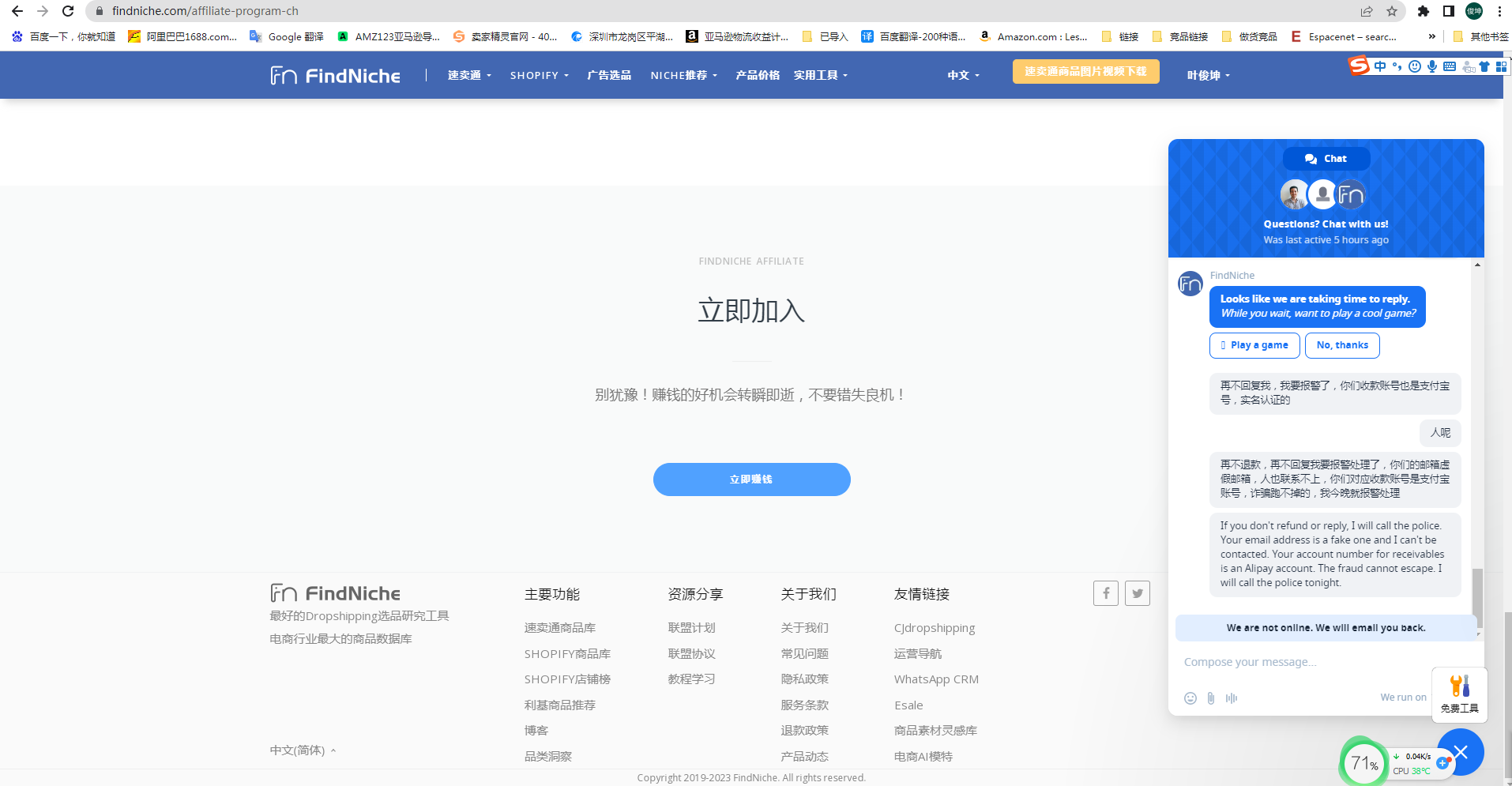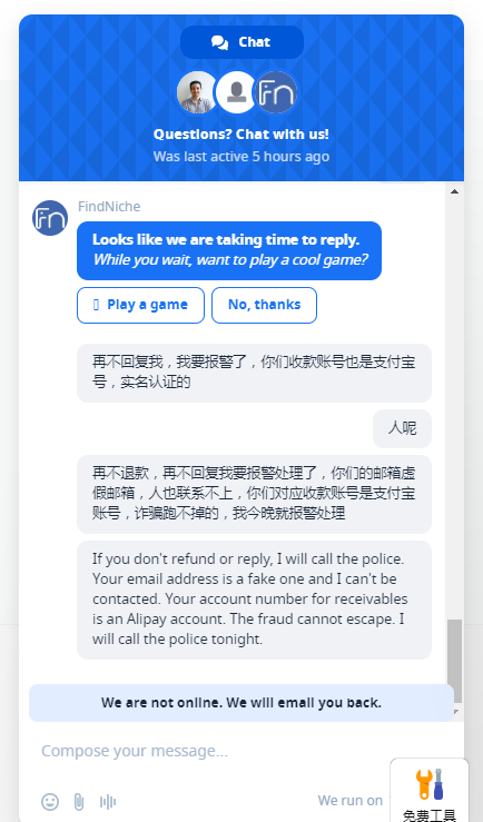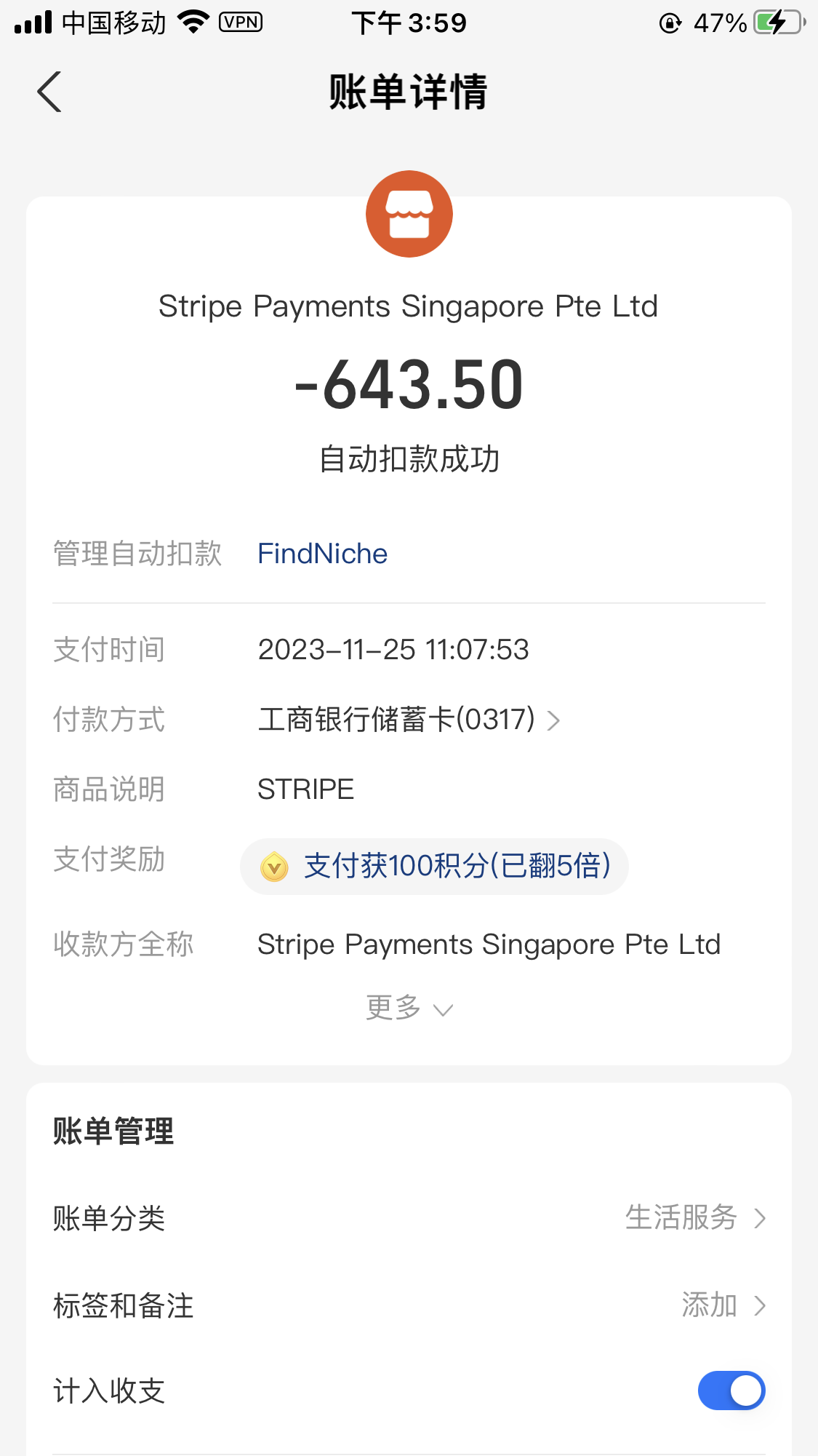 findniche(是一款跨境电商市场数据分析软件) findniche用3天试用1美金试用为诱饵,未经用户同意,恶意扣VIP月费643.5元(98美金). 我只是支付1美金试用该产品,如果好用的情况下才考虑继续购买。我想大部分人都是这样想的。 我试用了一天,发现跟我期望相差很大,也就放弃试用它了,也没怎么留意,谁知道过了3天收到扣钱短信。 网站也登陆不了,网站上联系电话都没有,只有在线客服,人联系不上,网页邮箱也是虚假邮箱 https://findniche.com/