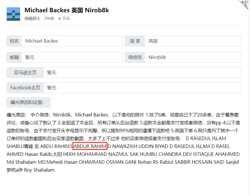 给了产品链接关键词说了要求刷4单留评,结果1天就给刷上了3单,出了单号催命一样要返款,没有警惕心和提前来这里查才上了当,发现2021年就有人曝光过这个人的收款号,收款码名字为 ABDUR RAHIM,收款头像为一个孟加拉还是巴基斯坦男人,返了3单的本金后告诉中介不需要第4单了,刷3单就够了,口头答应,第二天甩我第4单的单号和截图,威胁我不返本金就给差评。4单本金全返之后,没几天我找他让上评价,发现被拉黑了发不了消息了,这才发现被骗。