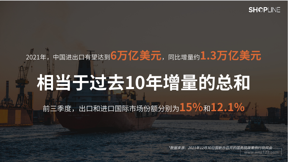 2021年中国进出口有望达到6万亿美元,同比增量约1.3万亿美元,相当于过去10年增量的总和,前三季度,出口和进口国际市场份额分别为15%和12.1%