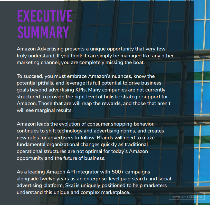 亚马逊引领了消费者购物行为的演变,继续改变技术和广告规范,并为广告商创造了新的新规则。品牌将需要快速做出根本性的组织变革,因为传统的运营结构并不是为当今亚马逊提供的发展机会和未来业务的最佳选择。