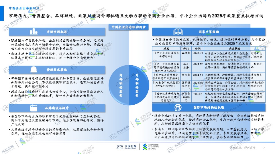 中国政策鼓励中小企业合规出海,系统性地降低企业出海合规成本与经营风险出海策略呈现多路径协同发展路线,已延伸基建、服务、产品等多元出海模式置接进入、合资等出海模式成功实践,中小企业可基于资源禀赋择取适配出海方案