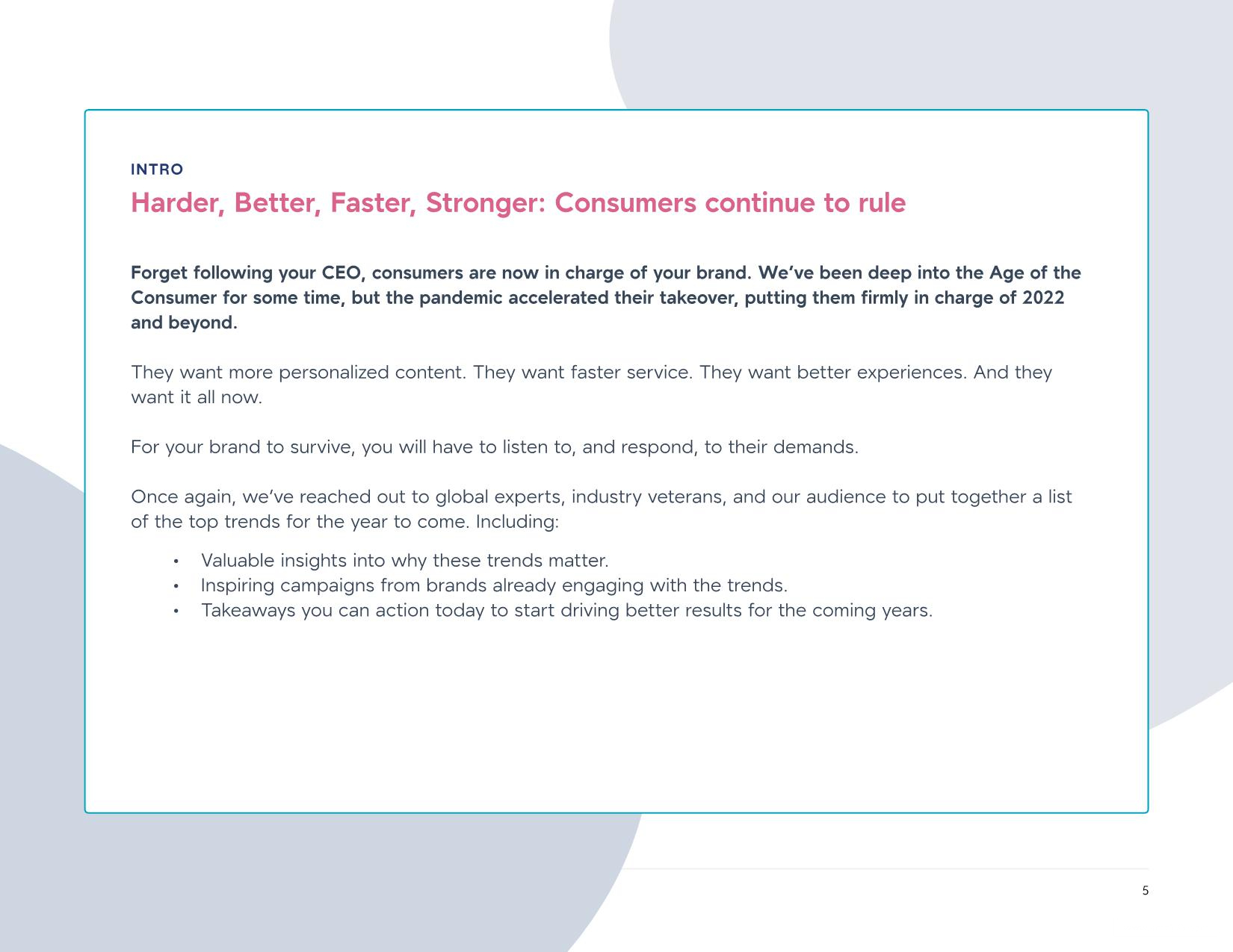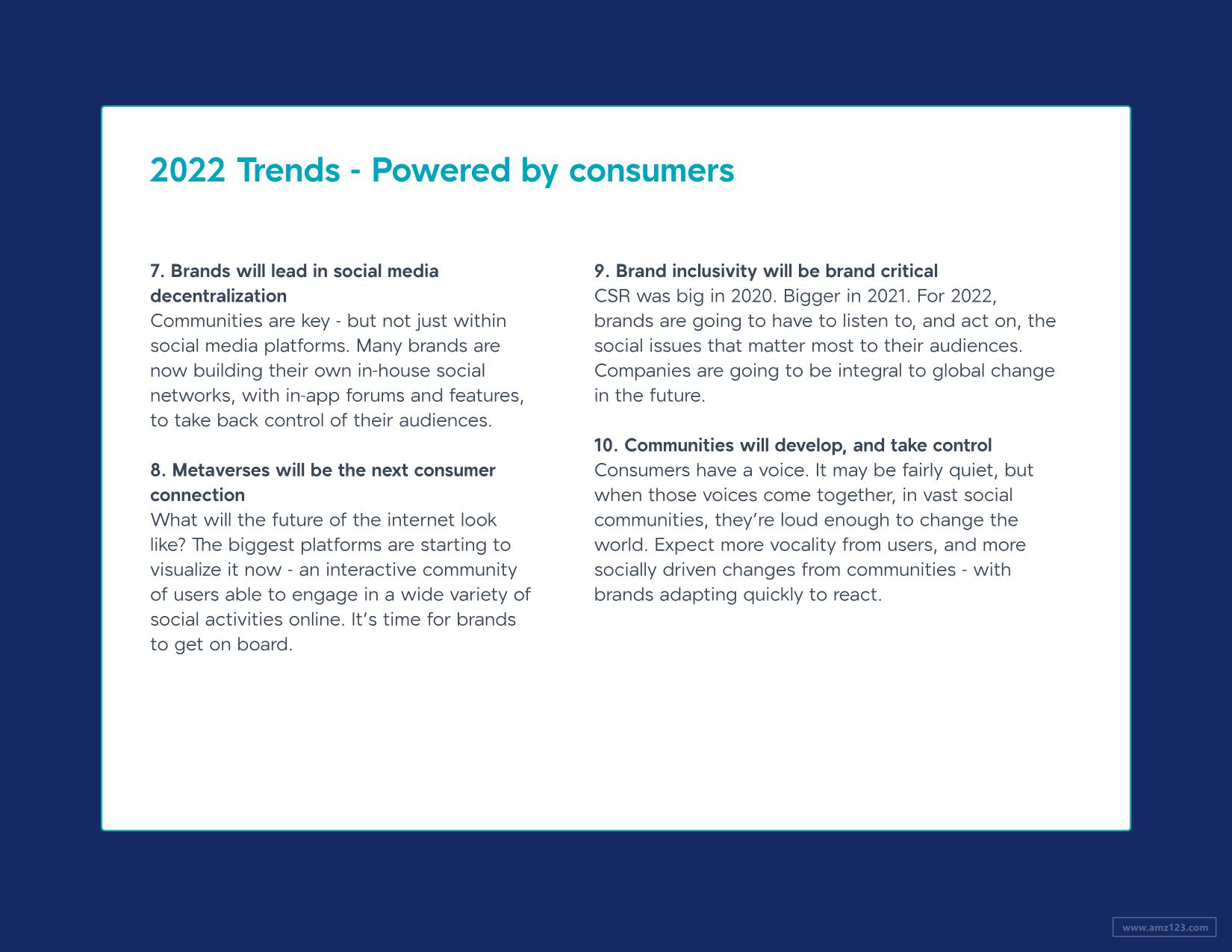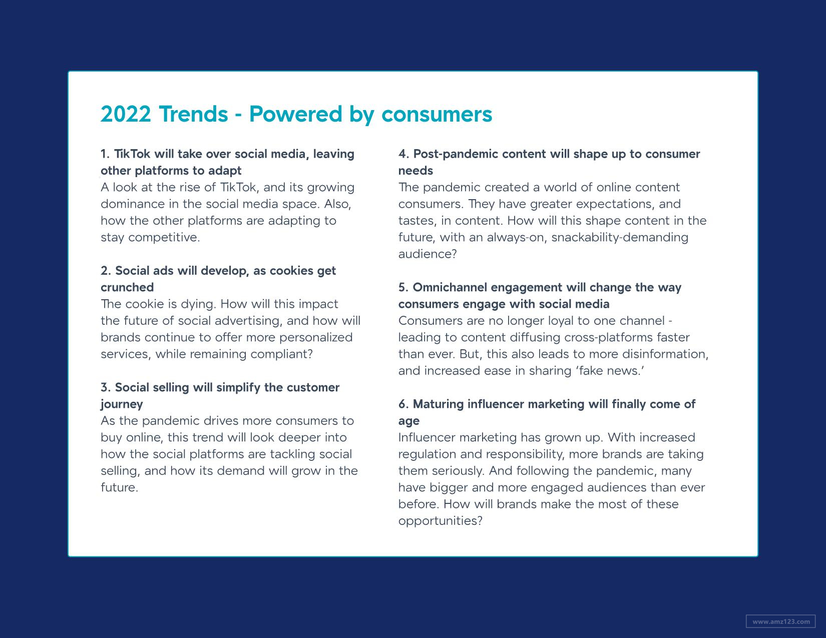 1. TikTok将接管社交媒体,让其他平台去适应看看TikTok的崛起,以及它在社交媒体领域日益增长的主导地位。另外,其他平台如何适应以保持竞争力。 2.社会广告将发展,因为饼干被压缩饼干正在死亡。这将如何影响社交广告的未来,以及品牌将如何继续提供更多的个性化服务,同时保持合规性?3.社交销售将简化客户旅程随着大流行促使更多的消费者在线购买,这一趋势将深入研究社交平台如何解决社交销售问题,以及其需求在未来将如何增长。2022年趋势--由消费者推动4。大流行后的内容将适应消费者的需求大流行创造了一个在线内容消费者的世界。他们对内容有更大的期望和品味。5.全渠道参与将改变消费者与社会媒体的接触方式消费者不再忠于一个渠道--导致内容比以往任何时候都更快地跨平台传播。但是,这也导致了更多的虚假信息,以及更容易分享 "假新闻"。成熟的影响者营销将最终走向成熟影响者营销已经长大了。随着监管和责任的增加,越来越多的品牌开始认真对待他们。而在大流行之后,许多品牌拥有比以往更大、更多的受众。品牌将如何充分利用这些机会?