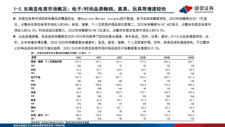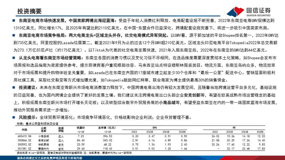 东南亚电商市场快速发展,中国卖家跨境出海迎蓝海:受益于年轻人消费红利释放、电商配套设施不断完善,2022年东南亚电商GMV规模达到1310亿美元,同比增长17%,且2025年有望达到2110亿美元。在中国-东盟合作日益深化、跨境配套设施完善下,将进一步吸引中国卖家布局。