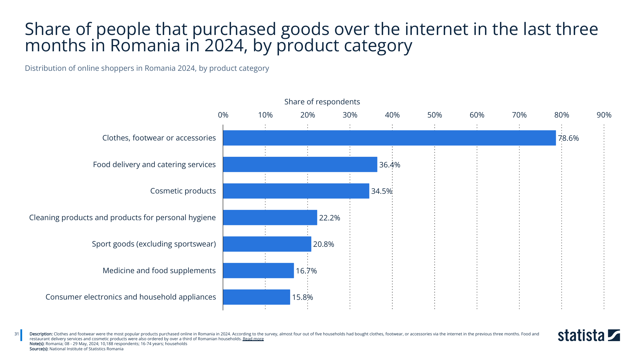 Statista在2024年对罗马尼亚超一万名在线购物者进行访问,高达78.6%的消费者表示,在过往三个月的线上购物记录中购买服装、鞋类及配饰类商品,位列第二的是食品或餐饮类服务,占据36.4%。除此之外,上榜的商品还包括化妆品(34.5%)、清洁或个卫产品(22.2%)、体育用品(20.8%)、药品及保健品(16.7%)、电子产品及电器(15.8%)。