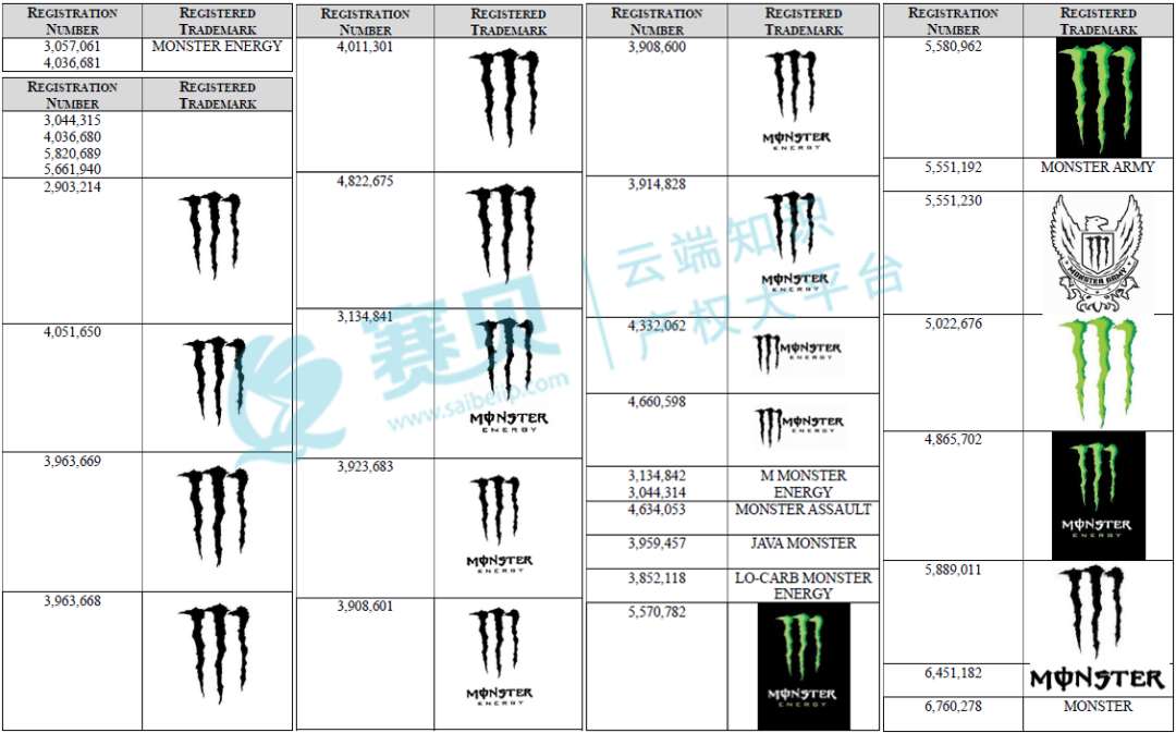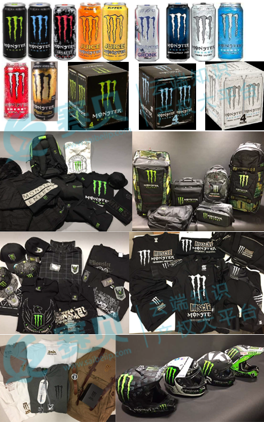 案件涉及原告30余项美国注册商标,像“MONSTER”“MONSTER ENERGY” 这些文字商标,覆盖范围广得很 —— 第 32 类的能量饮料、无酒精饮品,第 25 类的服饰,第 18 类的运动包、背包,第 9 类的头盔、耳机,第 16 类的贴纸、海报都算。还有那个绿色爪形图标,单独用或者跟文字组合用,在营养补充剂、珠宝、帐篷这些品类上都有注册。未经授权,卖家近似使用这些商标均可能构成侵权。