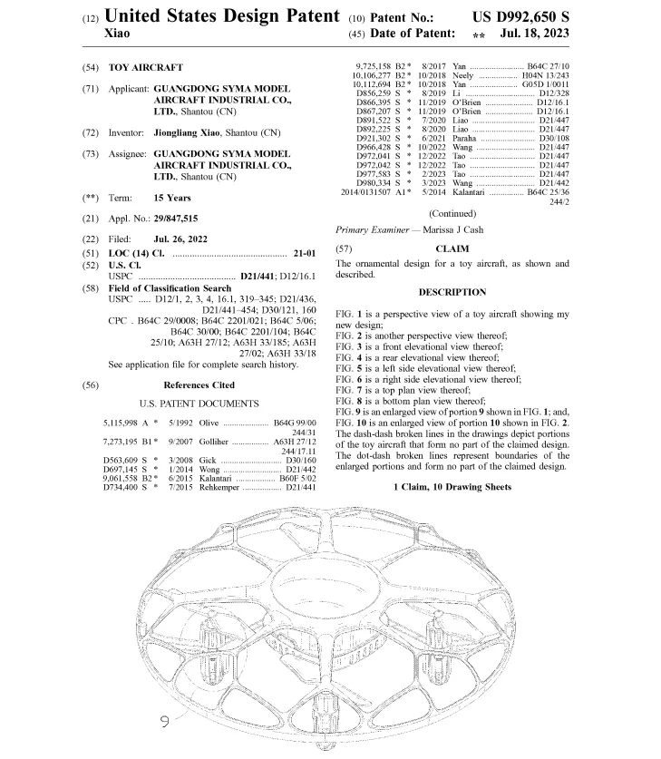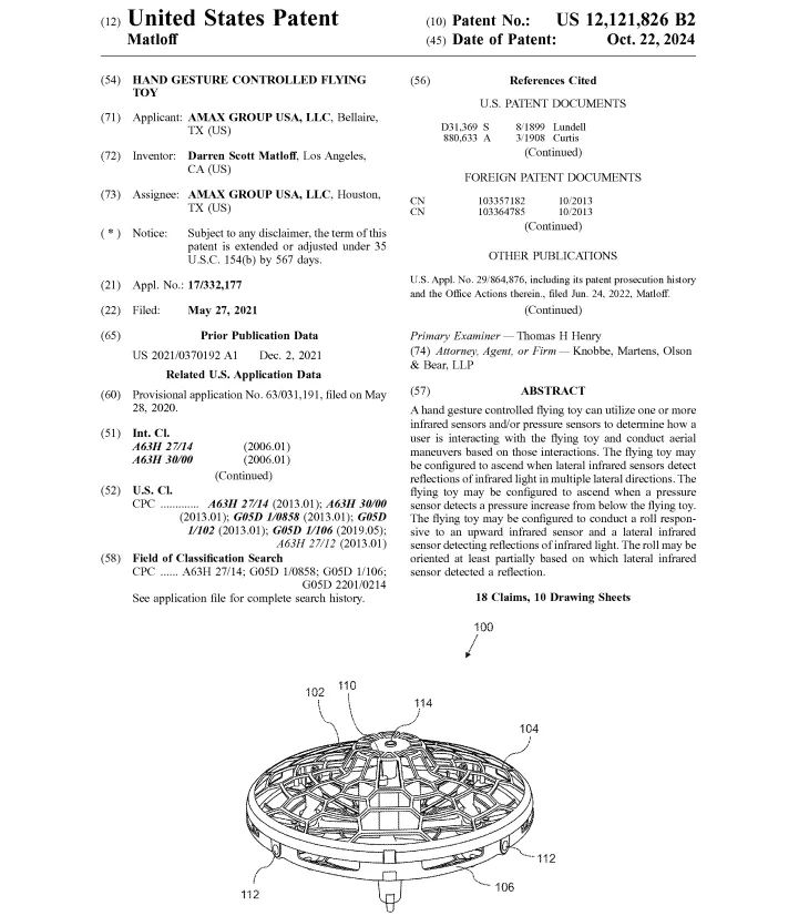 相关的美国发明专利也不少,以下是卖家朋友咨询较多的一件,专利名称“Hand gesture controlled flying toy(手势控制飞行玩具)”,专利号US12121826B2,专利权人为“Amax Group Usa, LLC”,申请日为2021年5月27日,授权公告日为2024年10月22日: