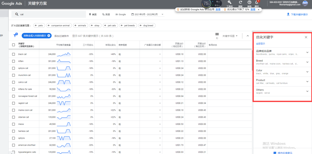 Google这个板块的功能也有个suggestion的功能,显示的内容也是搜索量,出家建议,PD等这些我们GG优化师经常关注的一些点。