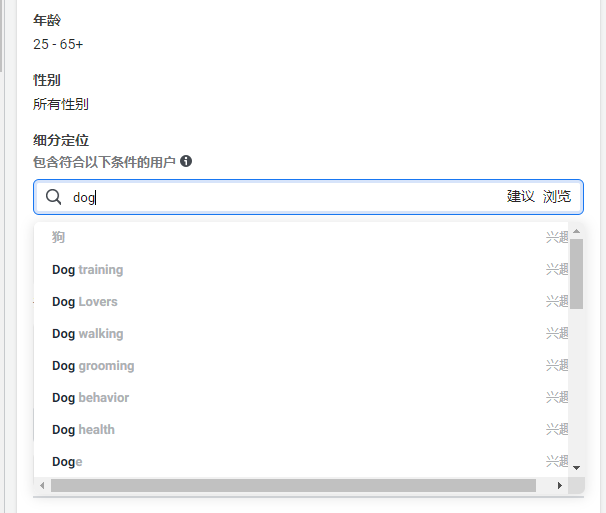 以Dog为例下面是facebook广告后台给推荐的相关的兴趣词,大概25个左右, 这些兴趣词肯定也是经常被其他做dog周边产品给定位的人群,那我们看看用这些adtargeting会给我们呈现什么样的表现形式。