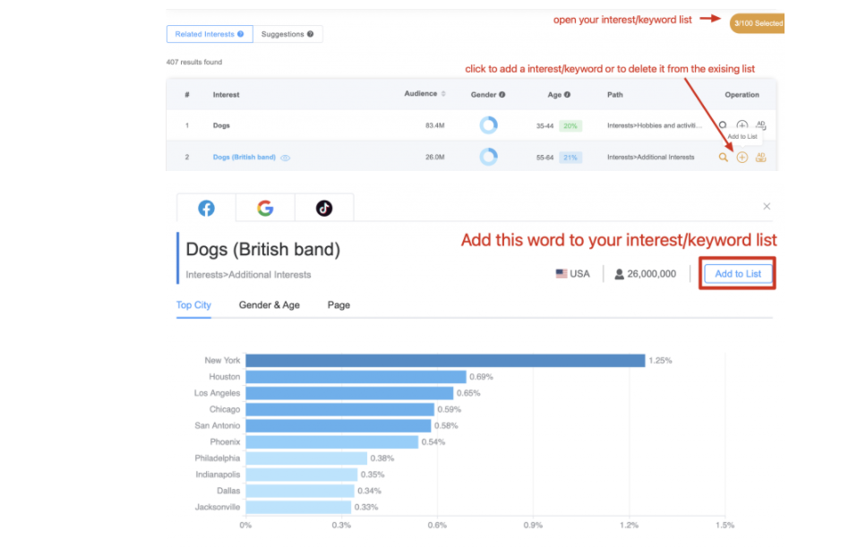 另外往细了看每个niche兴趣词点击进去会有top city, gender&age,page等相关的详细信息,发现you比较相关的兴趣词作为受众,可以添加为add to list跟你你的facebook广告相关联起来。