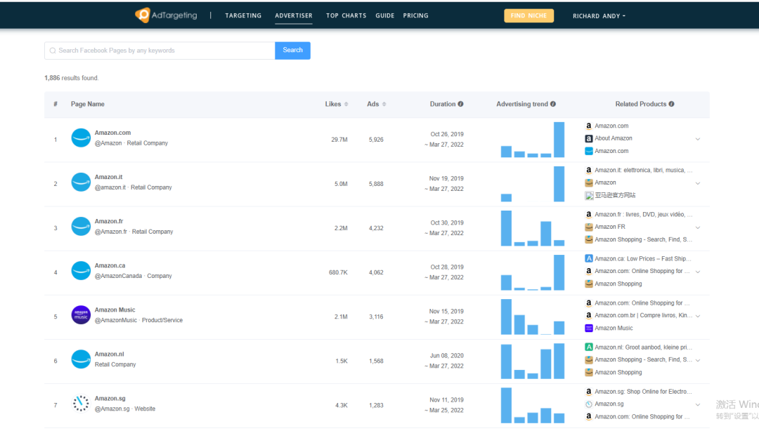 上面主要是发掘拓宽facebook niche兴趣此的用法,对于这些的兴趣词我们也要做个筛选跟归类,找出最相关的分成几个不同的类别去测试广告成效表现。另外一个功能就是可以看到很多其他广告品牌投放的广告周期,表现形式等,再advertise板块,打开可以看到page name,liks,ads数量,duration,advertising trend