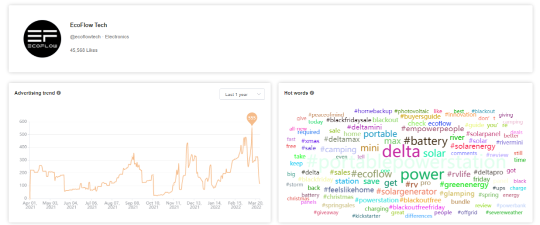 那比如我以时下比较火的户外便携储能电源ecoflow为例来看看,输入ecoflow选择相对应的page,可以看到他们广告投放的trend,page主页的高频词,投放的主要区域以及platform还有想对应的广告形式,这个对于分析竞品的facebook广告表现还是非常详细的, 另外还可以看到竞品投放的广告素材,文案等,可以看到ecoflow目前有3554个搜索的广告结果,这个数据量可以很好的分析他们投放的素材跟文案了,对于表现好的素材跟文案,也是可以参考下制作如何展示产品的功能以及表现形式等。