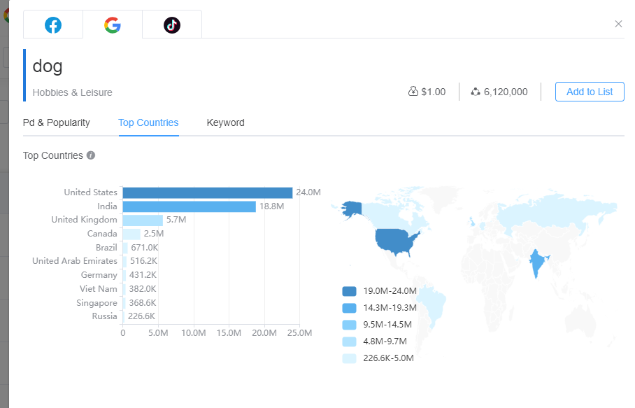 输入Dog为例, 可以看到adtageting给出了220个相关的兴趣词,比facebook广告后台推荐的25个左右的兴趣此多了很多, 可以看到也列出了兴趣词的audience size受众规模, 男女性别比例,年龄,path路径等非常详细的信息, 之前也问过他们商务, 这些数据都是通过API接口从facebook拿到的数据,这些受众的标签都是可以再facebook广告后台定位到的。刚刚大概扫了下, 给出的兴趣词还非常的广泛跟齐全除了dog,dod food,dog用品等直接的兴趣词之外,还有dog breed,related page/group,相关的杂志,e-shop等。