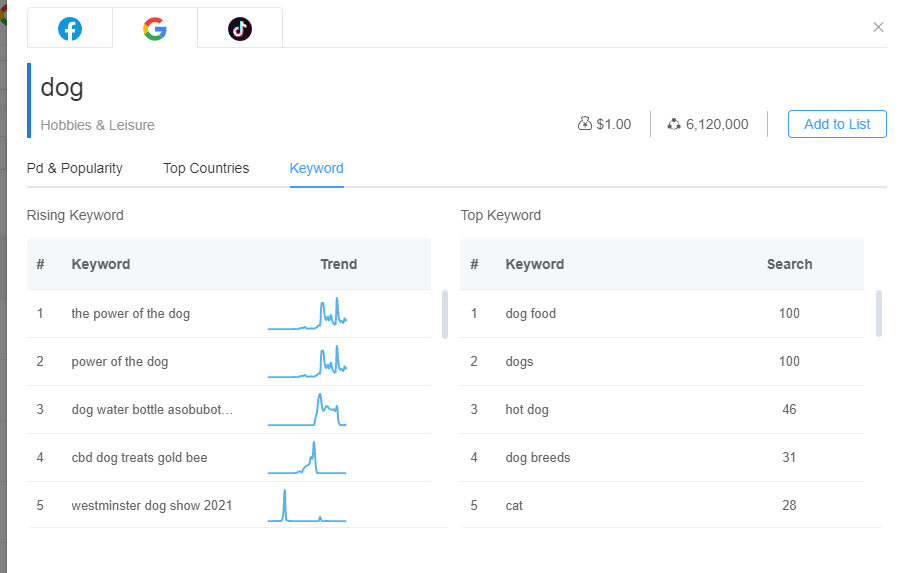 比如还是以Dog为例,可以看到dog以及related kws的搜索周期,搜索量,cpc出价,PD等信息,点击进去可以看到PD,Trend趋势, trend的趋势我猜应该是抓取google trend上的之前比对了几个,跟GT上的显示波峰是相对一致的以及上升的Rising kws跟Top kws热词,还是蛮齐全跟详细的,根据Rising kws正在上升的词对于我们优化关键词以及网站描述,内容制作都是个很不错的参考。