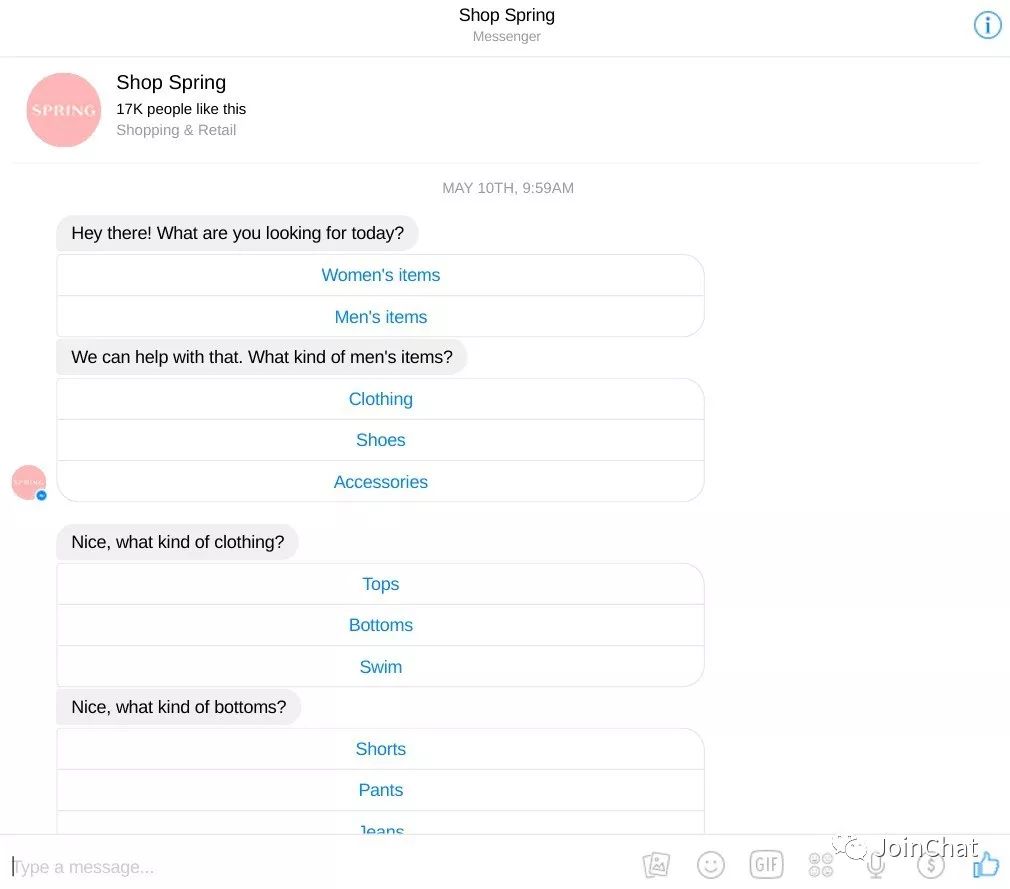 由于Spring的官网品类过于丰富,消费者很难一下找到想要的商品。为了使购物体验更畅快,Spring把官方Messenger(Facebook旗下的即时消息平台,类似于微信)打造成了顾客的专属“导购”:
