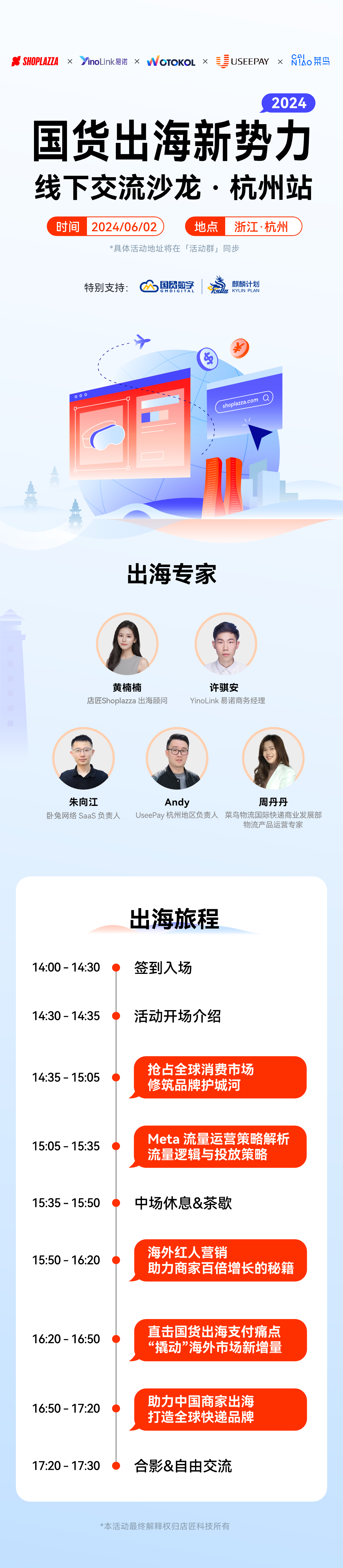 正是在这样的背景下,店匠Shoplazza 携手行业伙伴易诺、卧兔、Useepay 、菜鸟国际,共同推出「国货出海新势力」线下卖家交流沙龙·杭州站活动。