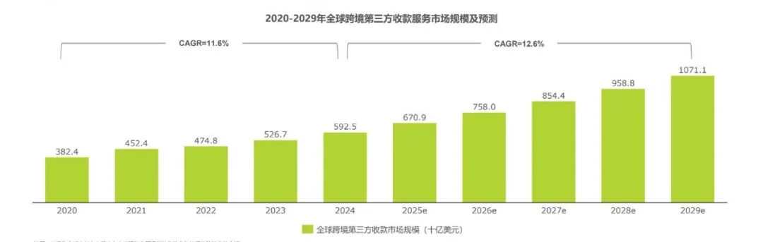 据艾瑞咨询数据显示,全球跨境第三方收款服务市场规模预计从2024年的近6000亿美元扩大至2029年的超10000亿美元。同期,中国跨境出口第三方收款市场规模也有望从4000亿美元增长至近7000亿美元,中国出海经济持续成为全球市场的重要推动力。