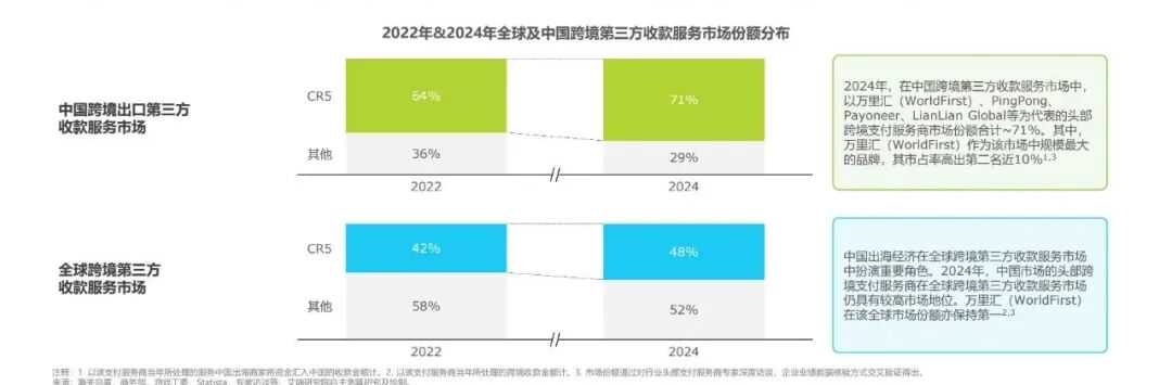 2024年,在中国跨境第三方收款服务市场中,万里汇(WorldFirst)作为该市场中规模最大的品牌,其市占率高出第二名近10%。同时,凭借其在中国出海经济中的深入布局与服务能力,万里汇也在全球跨境第三方收款市场中保持份额第一。