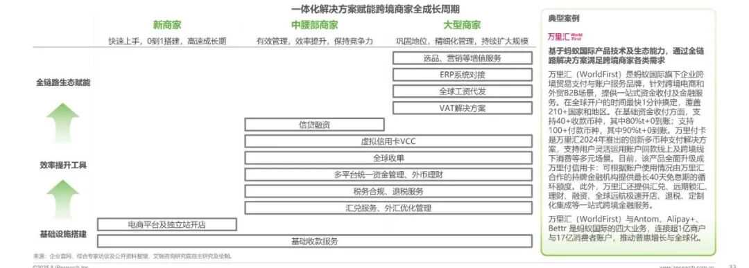 纵向——帮助新进入的商家从一键开店、实现 0 到 1 快速搭建,到伴随商家的规模成长与渠道扩张,提供外汇、税务、供应链金融、资金管理等服务;