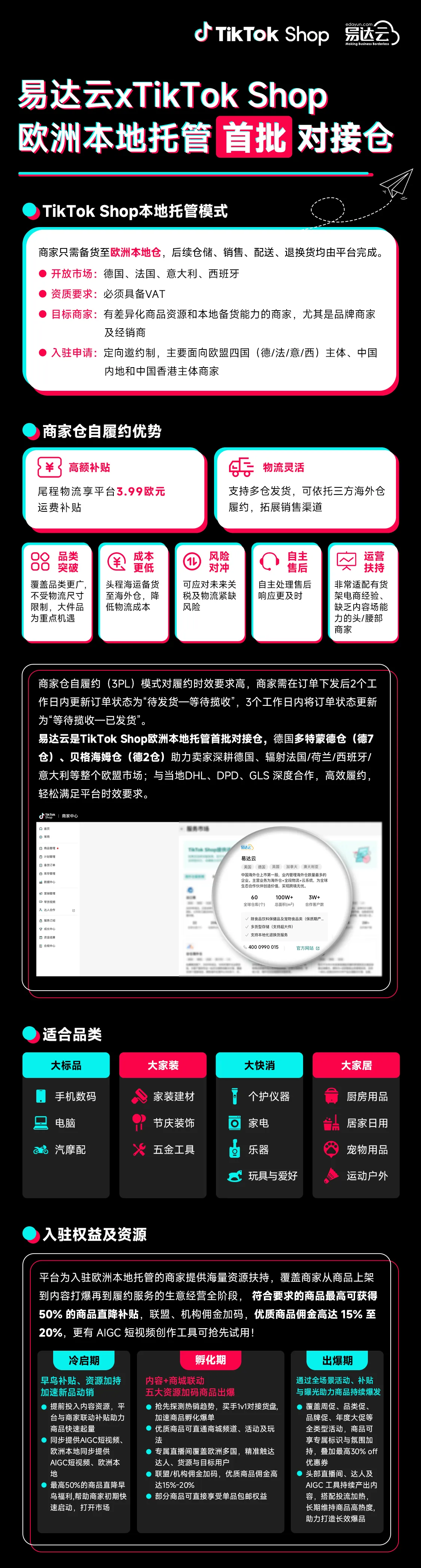 易达云正式成为TikTok Shop欧洲本地托管首批对接仓之一,获得平台定向合作赋能: