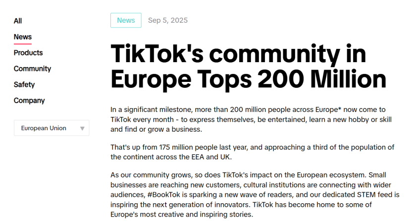 近日,TikTok官方发布消息称,其在欧洲地区月活跃用户已超过2亿,较2024年下半年1.75亿增长14.29%,覆盖范围接近欧洲经济区和英国大陆人口的三分之一。