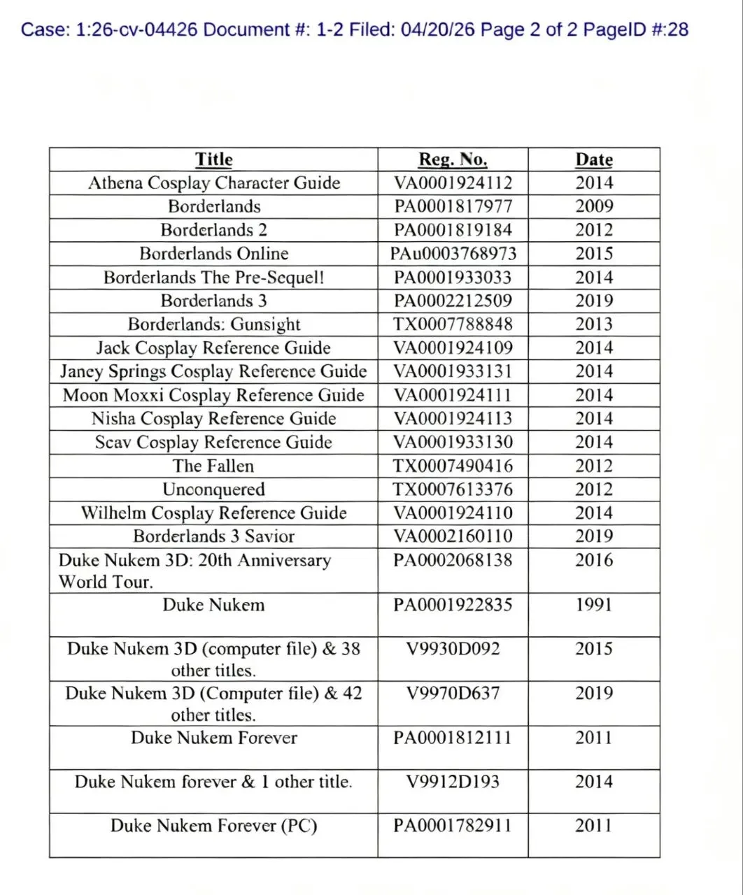 原告GEARBOX ENTERPRISES, LLC 是美国 Gearbox 游戏集团旗下专属IP管理主体。1999年成立于得州,旗下坐拥《无主之地》《战火兄弟连》等千万级爆款IP,并持有《毁灭公爵》《家园》等经典版权。