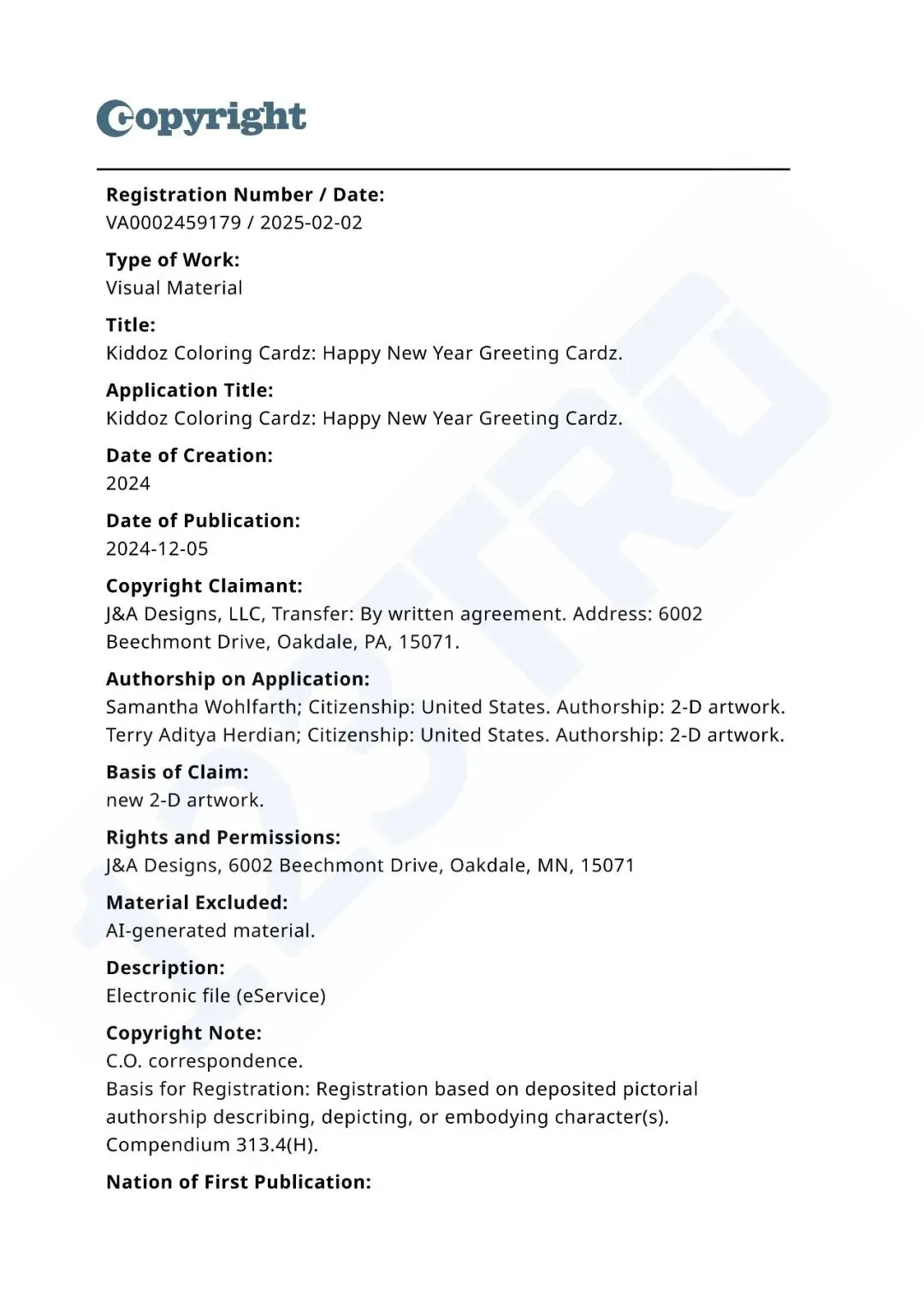 持有人:Samantha Wohlfarth ,儿童涂色书及贺卡设计师;Terry Aditya Herdian,节日或贺卡类创作者;J&A Designs, LLC,设计公司