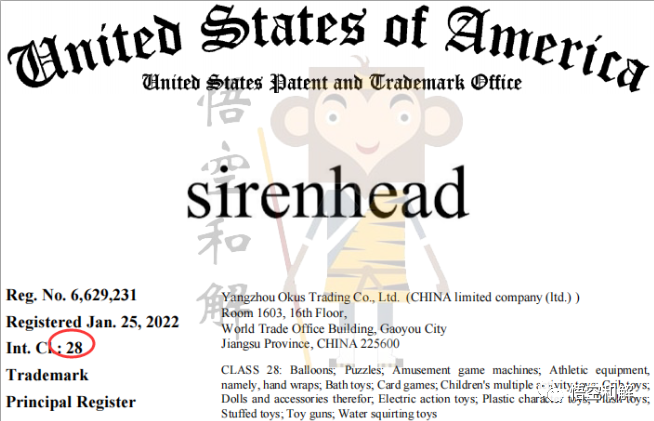 原告应该是国内某家公司YANGZHOU OKUS TRADING CO., LTD.,品牌名sirenhead 警笛头。
