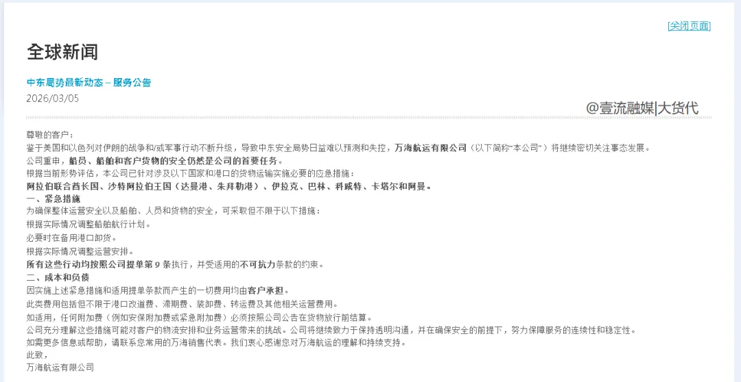 万海,3月5号——根据当前形势评估,本公司已针对阿拉伯联合酋长国、沙特阿拉伯王国(达曼港、朱拜勒港)、伊拉克、巴林、科威特、卡塔尔和阿曼等国家和港口的货物运输实施必要的应急措施。