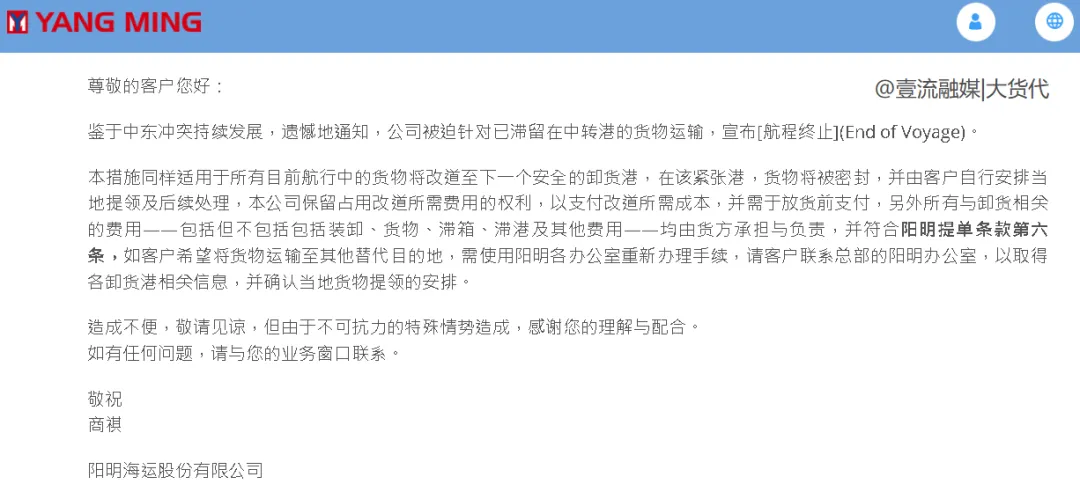 阳明,3月6号——鉴于中东冲突的持续发展,我们遗憾地通知您,公司被迫针对已滞留在中转港的货物运输,宣布航程结束(End of Voyage)。
