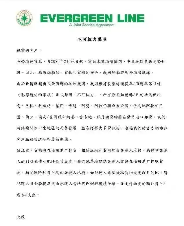 长荣,不可抗力公告——由于霍尔木兹海峡关闭、中东地区紧张局势升级,目前市场现状已超出长荣海运的控制范围,因此,长荣根据其海运单第 21 条规定正式声明「不可抗力」。