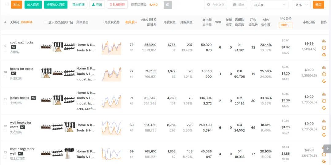 关键词趋势洞察: 关注“wall hooks for hanging”等功能性关键词的增长,优化Listing以匹配消费者需求。