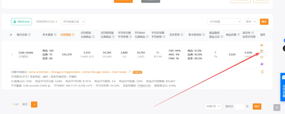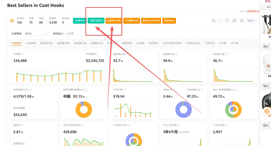 1. **A品类数据**:目的是为了看整个大盘的市场竞争情况和新品机会,以及价格区间,平均评论数量和星级,退货率,市场体量,市场趋势等等。