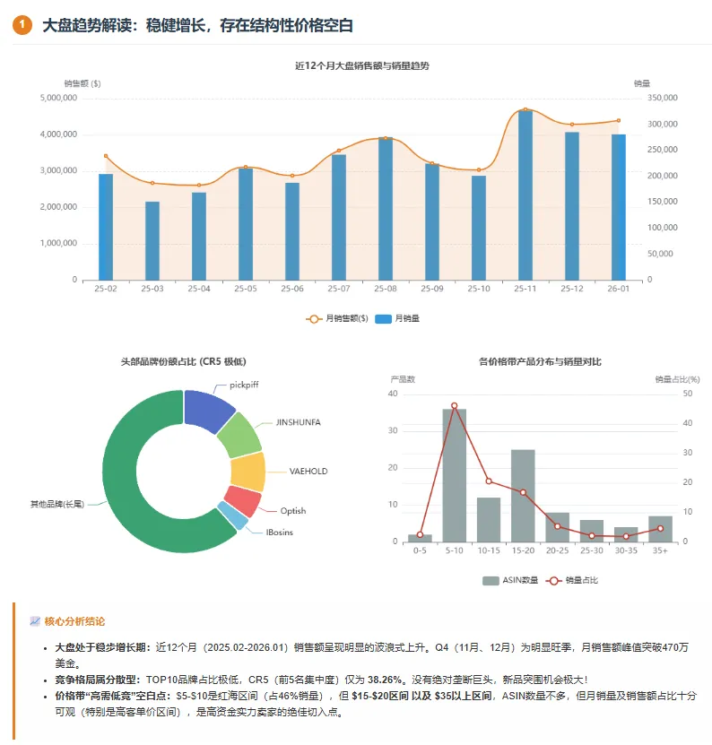 * **文字结论**:总结大盘是增长期还是成熟期?新品机会大不大?平均客单价区间是多少?竞争是否已经红海?