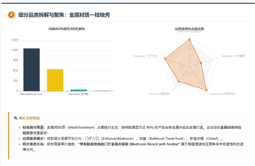 * **指令**:基于`top_asins`数据,按照属性(颜色/材质/尺寸)、应用场景(如室内/户外、家用/商用)、目标客群(如儿童/成人、男士/女士)进行交叉维度拆解。统计每个子类目的ASIN数量、总销量、平均价格、平均上架时间。