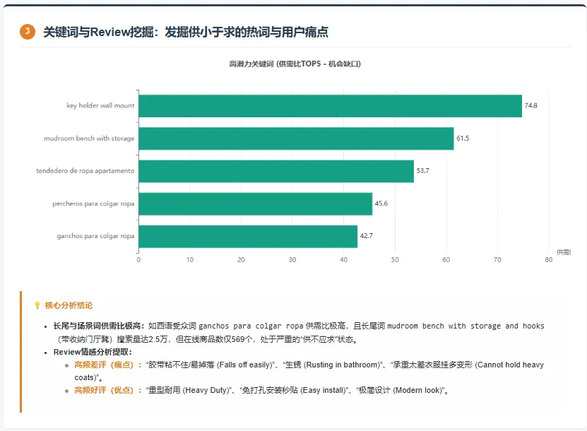 * **文字结论**:结合关键词机会和Review痛点,总结出2-3个“既有搜索热度、又有待解决痛点”的精准切入点。