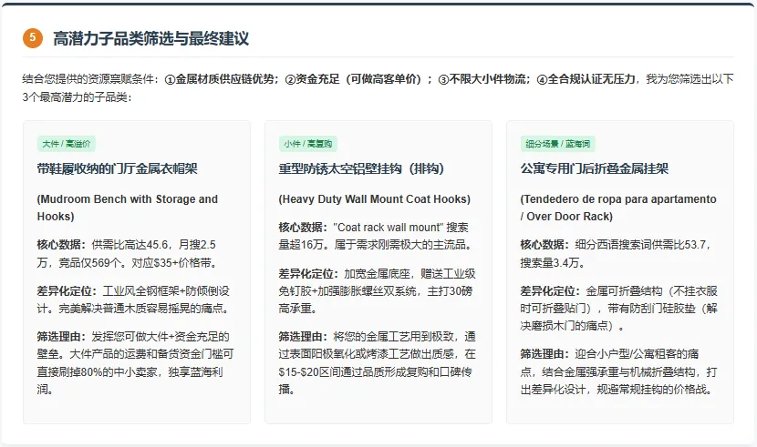* **指令**:现在,请综合以上所有分析结论,并考虑我即将提供的【供应链与资源约束条件】,筛选出3-5个最终值得深度验证的高潜力子品类。