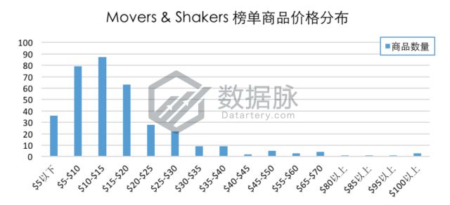 在Toys & Games品类Movers & Shakers榜单分析中,商品最高价$240.24,最低价$0.01,平均价格$17.76。骆探长(shujumai.com)发现,与上期分析相比,平均价格稍有 下滑;其中价格位于$10.00-$15.00区间内的商品数量较多,占比达19.91%,另有18.08%的商品其价格在$5.00-$10.00以内;此 外,仅有3款商品的价格在$100以上,占比达0.69%。