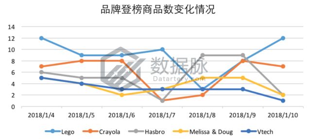 可以看到,在 Toys & Games 品类的Movers & Shakers榜单分析中,骆探长(shujumai.com)发现,品牌登榜商品数波动较大;品牌Lego共有38款商品登榜,凭借相对其他品牌出色的每日登榜商品数, 以总登榜63次,荣膺品牌排名首位;品牌Crayola共登榜20款商品,以登榜41次的成绩,位列品牌排名第二;品牌Hasbro以21款商品登榜,累计总登榜37次,位列品牌排名第三;品牌Melissa & Doug登榜18款商品,累计登榜26款商品,位列品牌排名第四;品牌Vtech共有15款商品登榜,累计登榜22次,位列品牌排名第五。