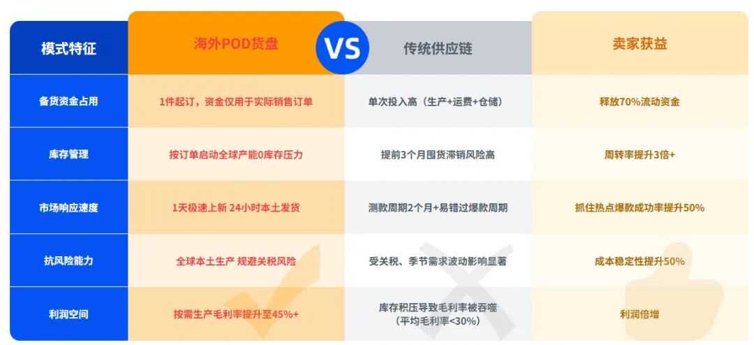 降本:传统货盘批量进口关税高,而海外POD货盘按需生产,将批量高额成本拆解为分散的低额成本。对中小卖家而言,这相当于把“固定成本”转为“变动成本”,大幅减轻资金压力,能有效降低资金周转压力。