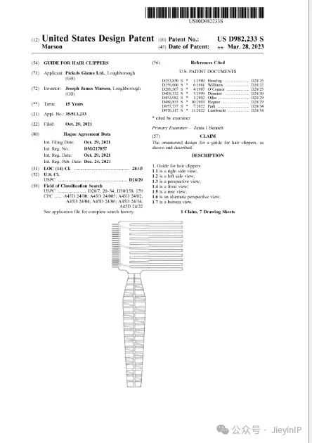 本案为外观专利维权,涉案专利申请日期2021年10月29日,下证日期2023年3月28日,专利编号US D982233 S: