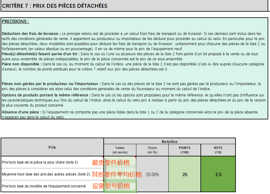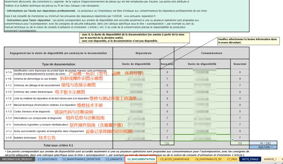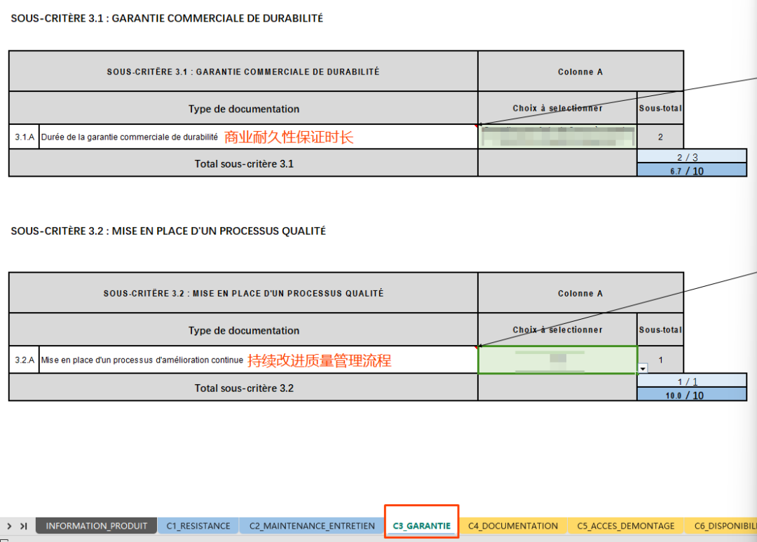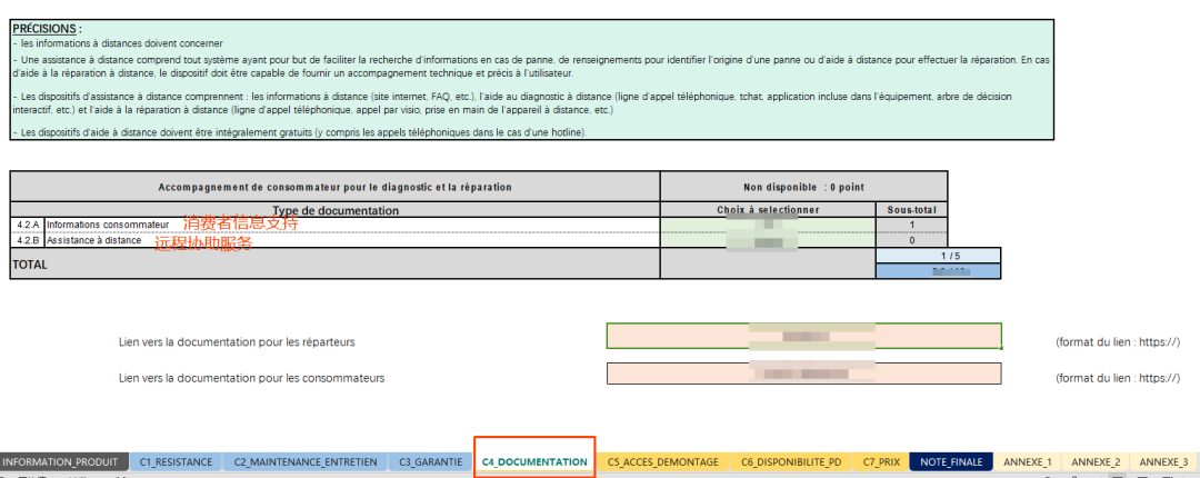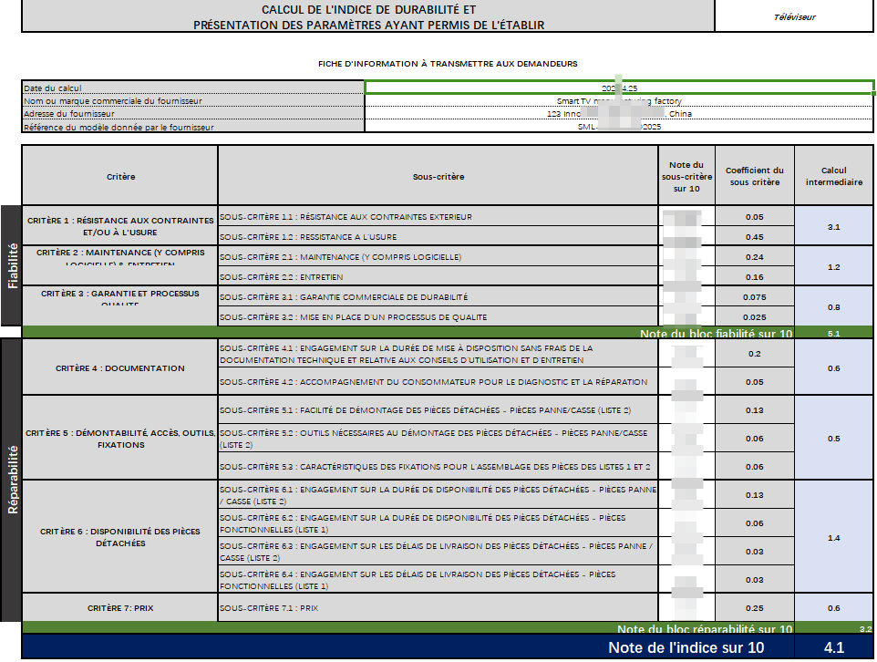 在所有子项填写完成后,系统将自动计算出总得分,并显示产品耐用性指数(Durabilité Index)。