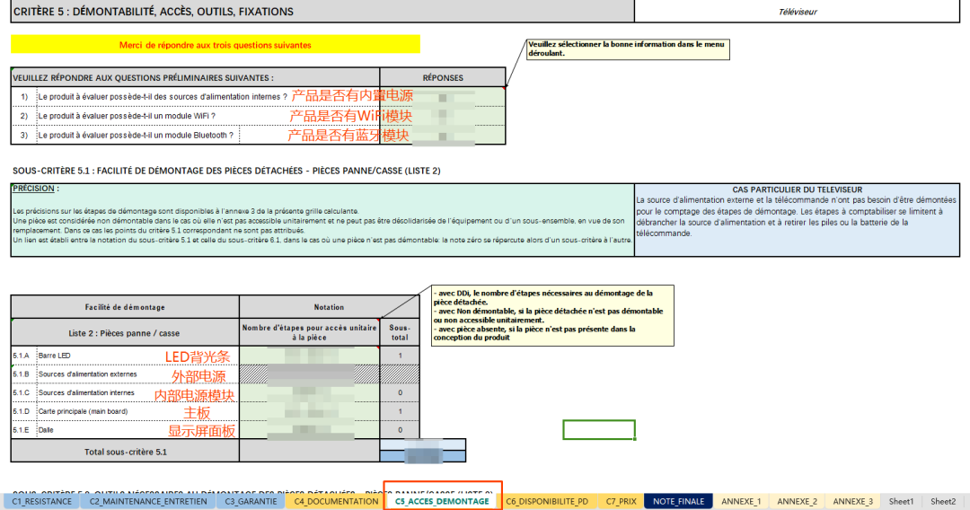 根据商品类型(如电视机或洗衣机),选择相应的产品工作表进行填写。整个计算流程由若干评分子项组成,您需要依次完成以下各个工作表的填写: