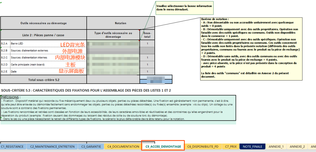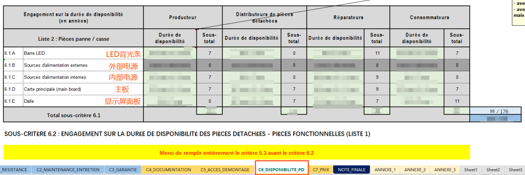 请前往法国政府网站的“Indice de réparabilité et de durabilité”页面,点击“Télécharger les grilles d’évaluation”(下载耐用性指数网格)链接。下载后,您将获得一个 Excel 文件,其中包含电视机(TV)和洗衣机(Lave-linge)的计算模板。“下载耐用性指数网格”中的文件如下:
