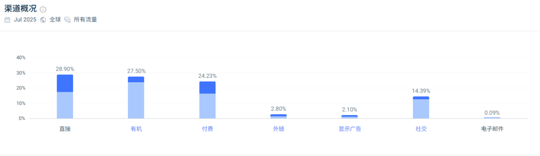 在销量起势后,Fiido开始将重心转向独立站运营。到2025年7月,独立站的全球月访问量已达170万,其中直接流量占比达到29%,意味着三成用户会主动搜索品牌名或输入网址进站。