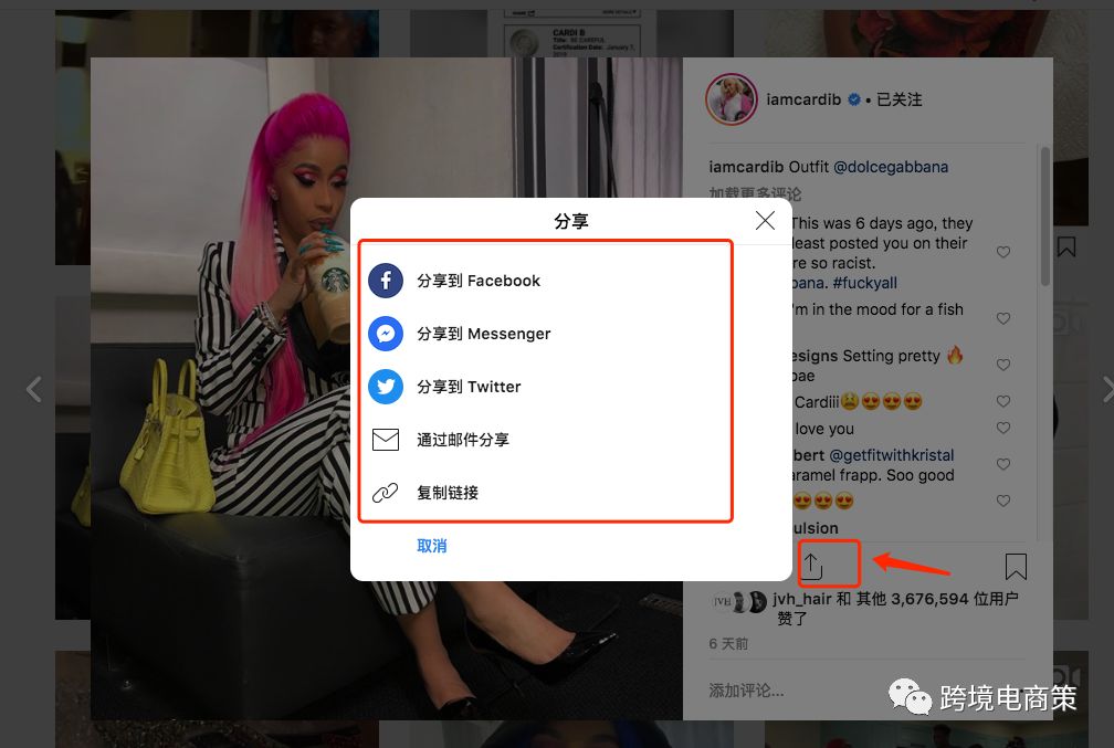 这社媒神奇的地方就是,很多人很少天天发原创的东西,基本上互相转发喜欢的,觉得好看的图片,图片下面带着链接,说明什么呢? 有人喜欢这个图片里的产品直接可以点击产品购买,如果你的pin(发的某一张图)被一个超级大的网红 re-pin 转发了,这个可能性很大,远远超过instagaram 和facebook 因为ins 上面你没法直接转发别人的图片或者视频,只能从ins 直接转发到邮件,blog,或者fb上面,比如请看下面(我们转发cardiB)的图片看看 会出现这样的画面
