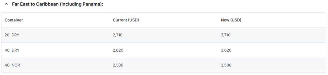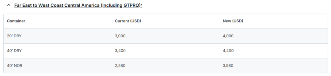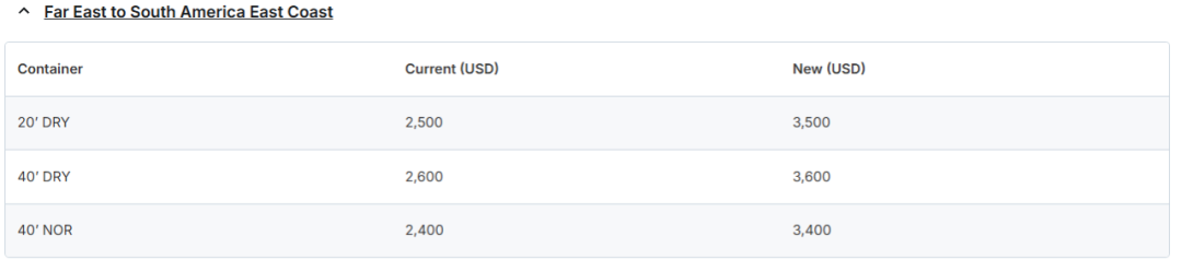 这一调整反映了到南美洲西海岸、墨西哥、中美洲和加勒比地区每箱增加1000美元,到南美洲东海岸每箱增加1000美元,适用于整个远东到南美洲东海岸和西海岸、墨西哥和加勒比地区的服务(基地港和出口港)。