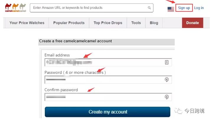 https://camelcamelcamel.com/。点击“sign up”,填写邮箱地址和密码,创建账号,目前不需要邮箱验证,非常简单方便。