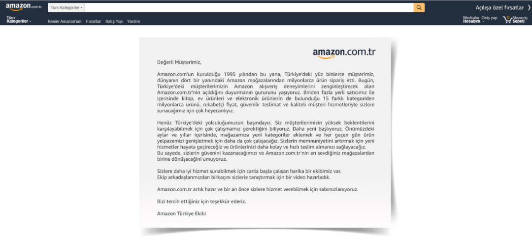 大家进入到亚马逊土耳其站的官网,会发现在其主页最上方显示一份声明图片消息。该声明为亚马逊土耳其团队(AmazonTürkiye'de)发布。通过声明的内容,我们可以看出,他们非常自豪地宣布亚马逊土耳其站正式上线运营。该团队表示: