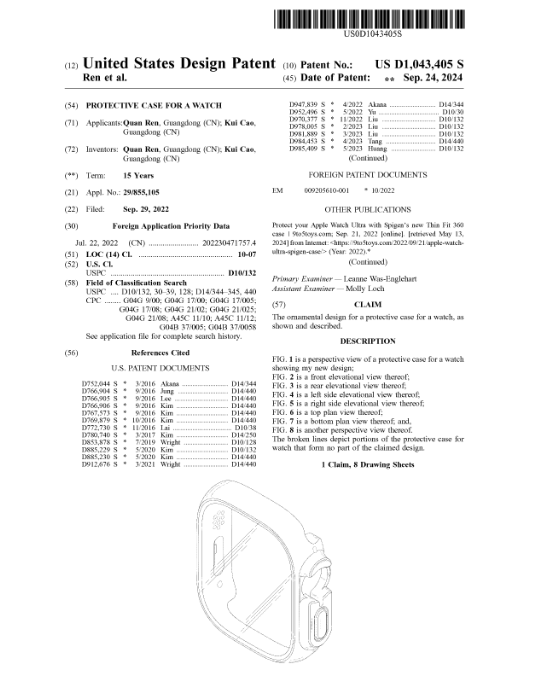 涉案专利为手表保护壳,专利号是 US D1,043,405 S,注册日期为2022年9月29日,下证日期为2024年9月24日。以下是专利详情,跨境卖家选品时需注意,未经授权切勿上架!